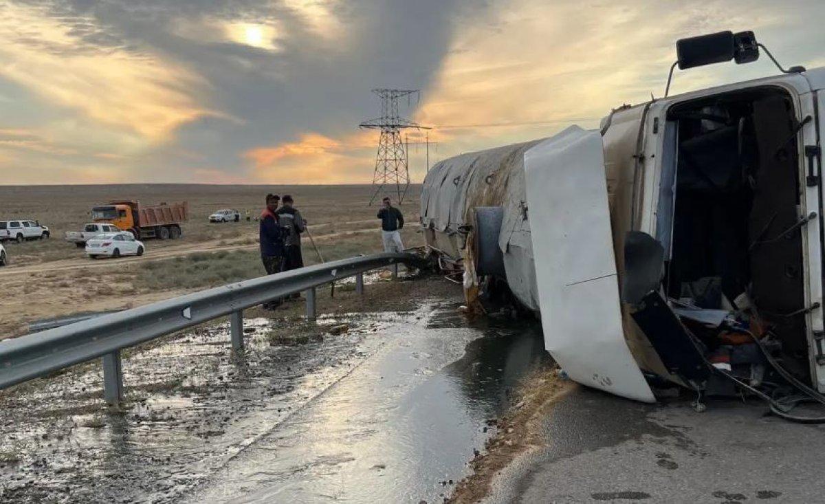 Как стало известно из сообщения департамента экологии Мангистауской области, фура Shacman перевозила нефть. Из-за опрокидывания грузовика нефтепродукты вытекли на землю, что является нарушением экологического законодательства.