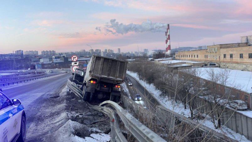 "Водитель большегруза не справился с управлением транспортного средства и совершил наезд на леерное ограждение. В результате дорожного-транспортного происшествия никто не пострадал", — говорится в сообщении.