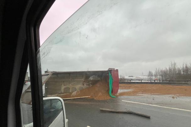 На кадрах очевидцев с места видно, что грузовой автомобиль перевозил песок, который также рассыпался на дорогу.