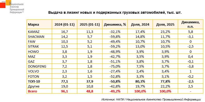 Всего за данный период в России было выдано в лизинг 48,8 тыс. новых и подержанных грузовых автомобилей, что на 49,2% меньше результата 2024 года (96,1 тыс. ед.). Выдача в лизинг ТОП-10 марок грузовиков сократилась более чем вдвое, их совокупная доля упала с 80,3% до 77,8%.