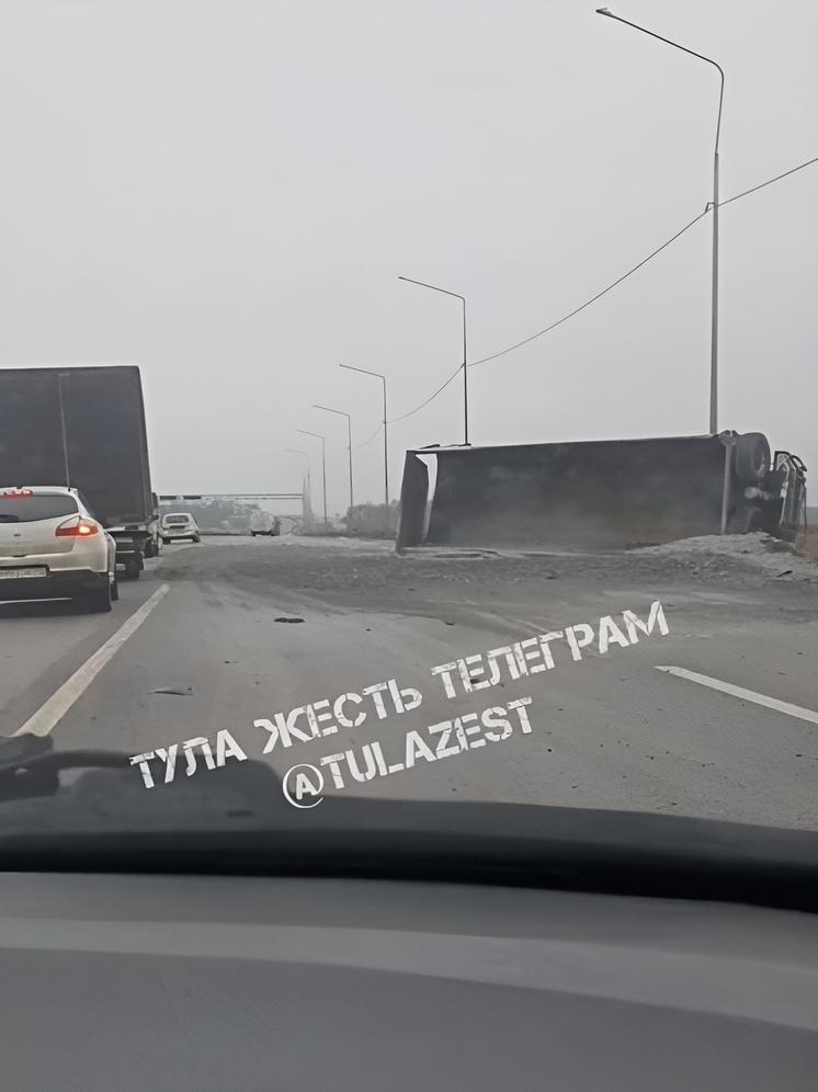 Видеозапись с места публикует Telegram-канал «Тула Жесть». На кадрах видно, что прицеп грузовика, который перевозил сыпучий материал, опрокинулся на бок. Часть груза высыпалась на проезжую часть.
