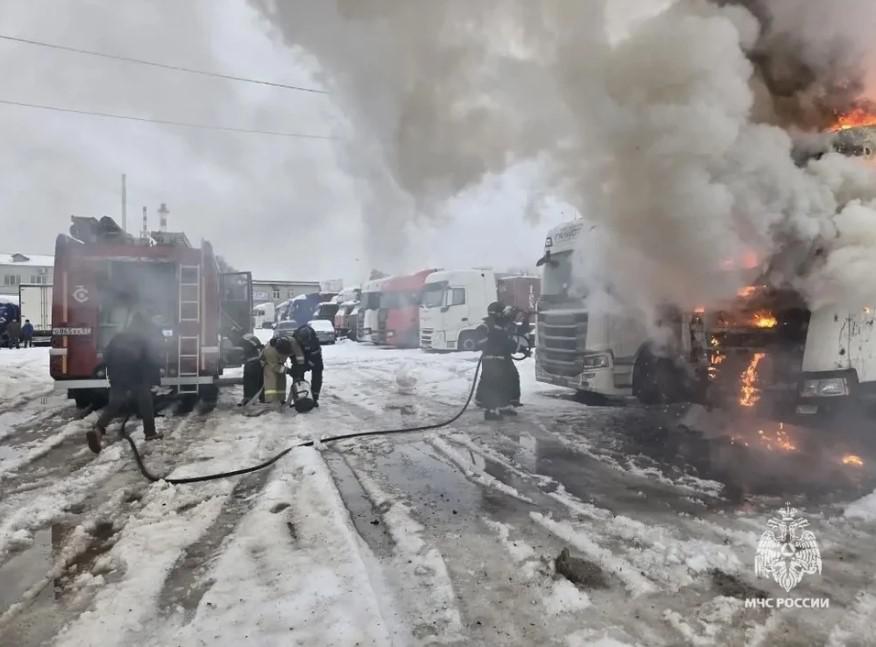 Прибыв на место происшествия, пожарные обнаружили горящей кабину автомобиля. Огонь бушевал и стремился перекинуться на стоящий возле грузовик. Пожарные потушили возгорание. Ущерб от пожара – выгоревшая кабина одного грузового автомобиля и оплавившаяся кабина другого. При пожаре, к счастью, никто не пострадал. Причина возгорания грузовика устанавливается специалистами.