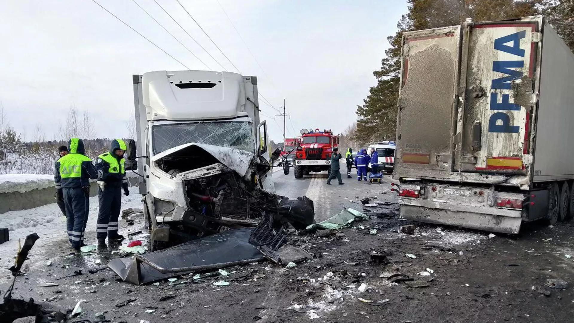"На 32-м километре автодороги Тюмень-Боровский-Богандинский произошло массовое ДТП. По предварительным данным, фура Volvo выехала на встречную полосу, по дороге касательно задев "Ладу Гранту". Далее произошло столкновение с большегрузом "Камаз" и Audi A6, после - лобовой удар с автомобилем "Газель Некст", - говорится в сообщении.