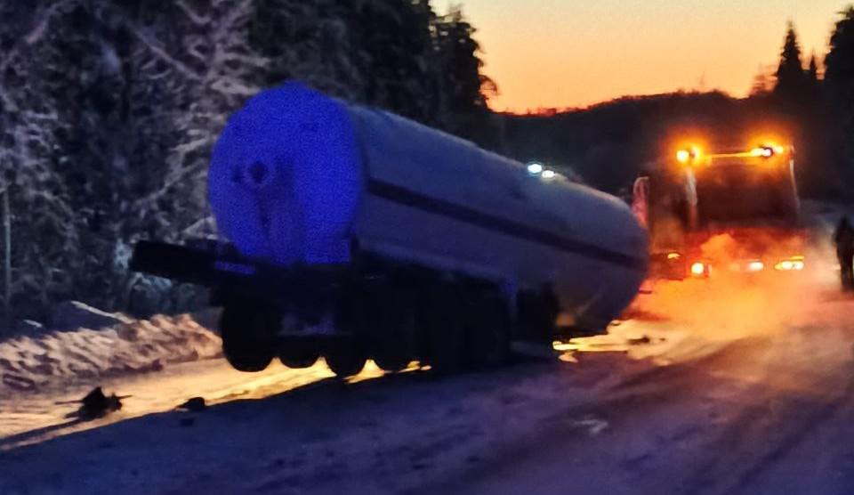 В экстренные службы в 8.09 сообщили что на 1116 км ФАД Р-21 «Кола» фура съехала с проезжей части в обрыв и там опрокинулась на бок. При этом прицеп грузового автомобиля Daf остался на дороге.
