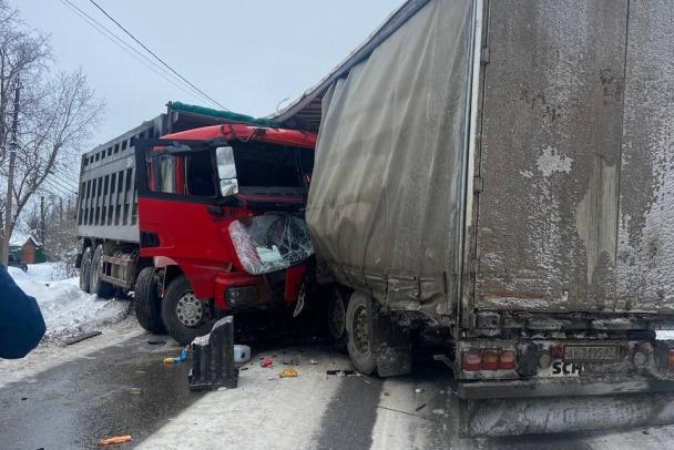 На кадрах видно, что в ДТП попали красный грузовик с прицепом и серый с полуприцепом. Первое авто буквально протаранило второе, у обоих машин серьезные повреждения. На фото попало, что у места аварии собралась пробка.