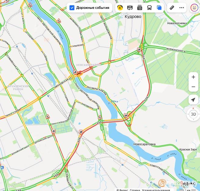 Одновременно такой же длины затор скопился на внутреннем кольце — пробка тянется от Мурманского шоссе до вантового моста.