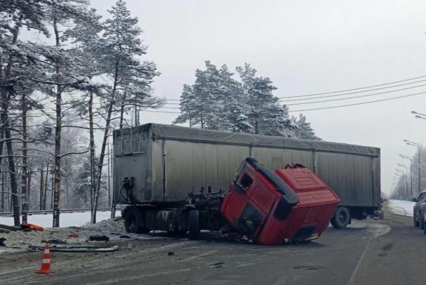 На участке фура врезалась в барьерное ограждение, один человек пострадал, сообщает "Фонтанка.ру". От удара кабина отвалилась, полуприцеп перегородил дорогу.