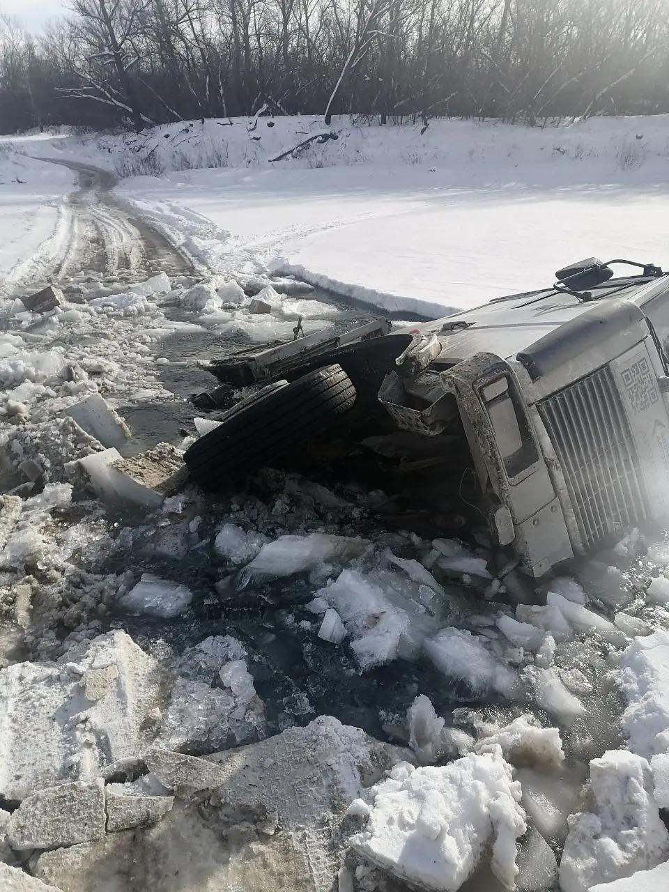Как сообщают очевидцы, ЧП произошло в Кинельском районе сегодня утром 12 февраля. Грузовой МАЗ провалился на переправе через реку Самара, где раньше был Спиридоновский мост.