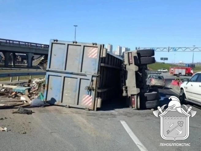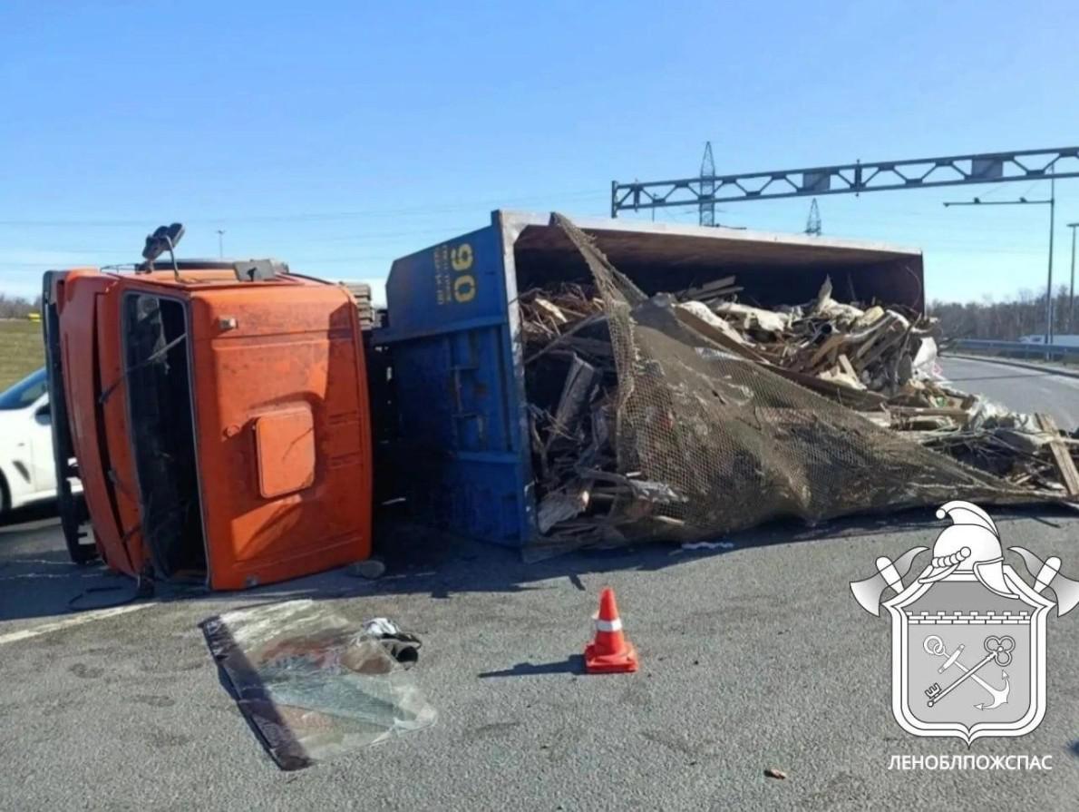 Около 14:30 8 апреля на съезде с внутреннего кольца КАД на Мурманское шоссе водитель мусоровоза КАМАЗ не справился с управлением, и машина опрокинулась на левый бок, сообщили в ГКУ «Леноблпожспас» и ФКУ Упрдор «Северо-Запад». Из пухто на проезжую часть высыпался строительный мусор.