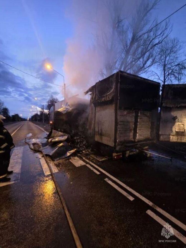 Ночью 8 апреля в Калужской области загорелась фура. Пожар произошёл в районе деревни Крюково Юхновского района на трассе А130 около четырёх часов утра.