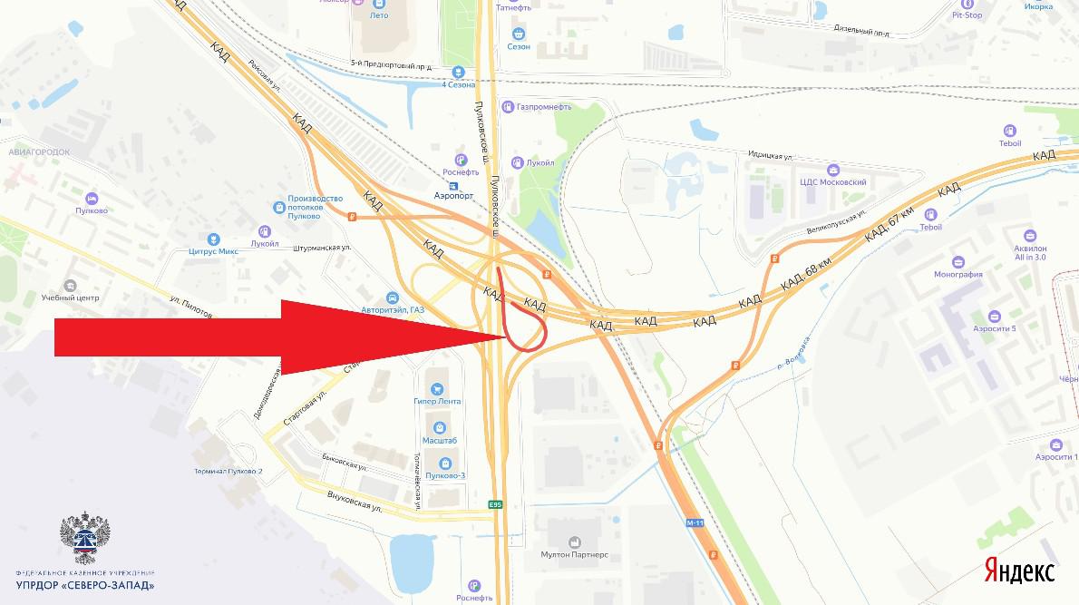 Федеральное казенное учреждение «Управление федеральных автомобильных дорог «Северо-Запад» имени Н.В. Смирнова Федерального дорожного агентства» (ФКУ Упрдор «Северо-Запад») сообщает, что в связи с производством дорожных работ на 68 километре автомобильной дороги общего пользования федерального значения А-118 Кольцевая автомобильная дорога вокруг города Санкт-Петербурга (далее – КАД), на транспортной развязке КАД на пересечении с Пулковским шоссе полностью перекроют съезд №8.