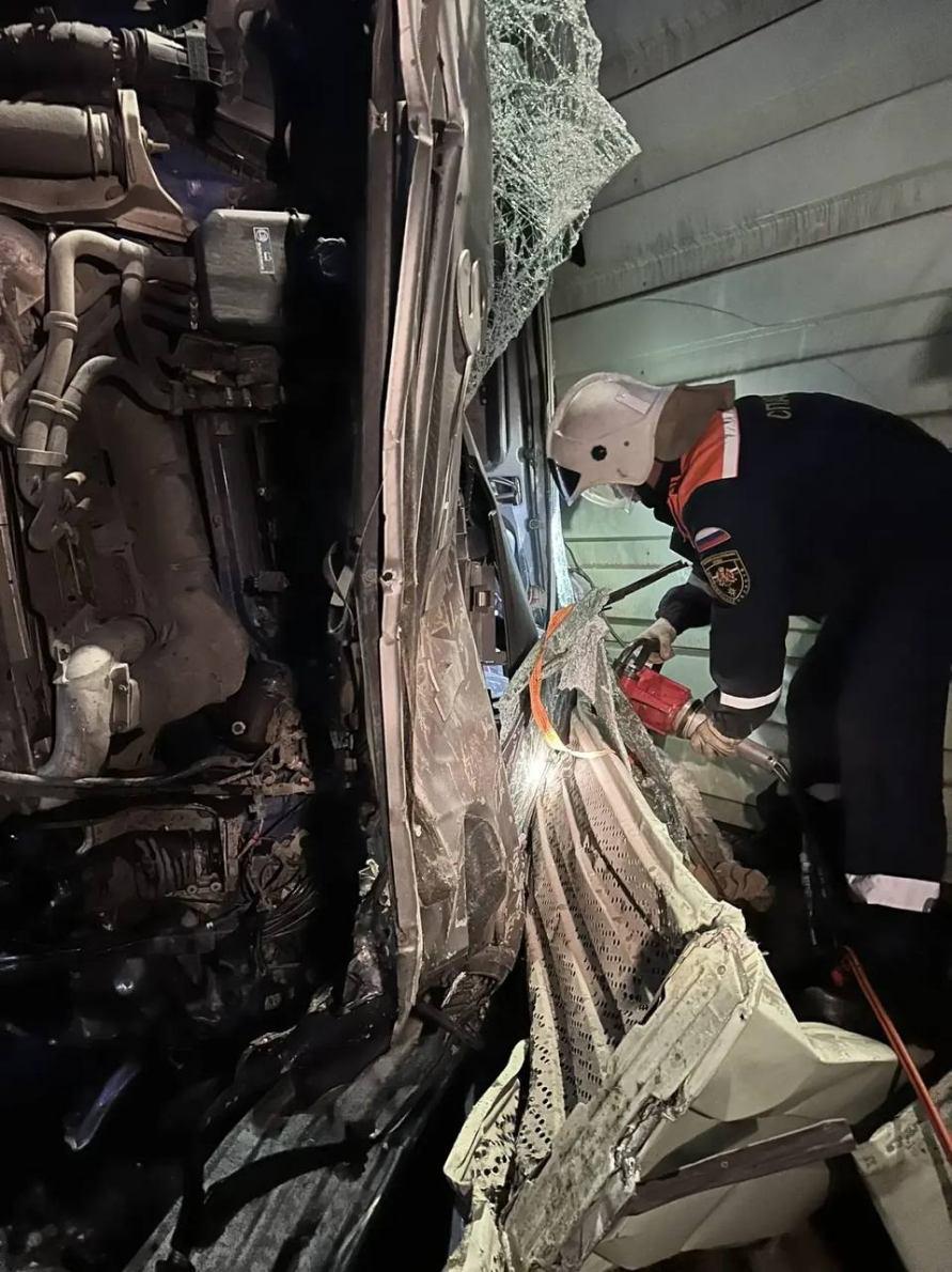 Фура перегородила трассу, для деблокировки водителя потребовалась помощь сотрудников аварийно-спасательной службы.