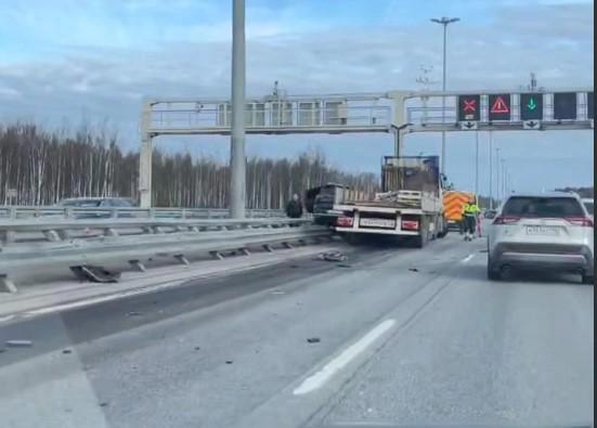 Дорожный инцидент произошел на участке ЗСД в районе поселка Белоостров в Курортном районе города. По предварительным данным, у большегруза взорвалось колесо, он потерял управление и прижал оказавшийся рядом автомобиль к ограждению. Обошлось без пострадавших.